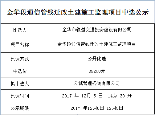 金華段通信管線遷改土建施工監(jiān)理項(xiàng)目中選公示