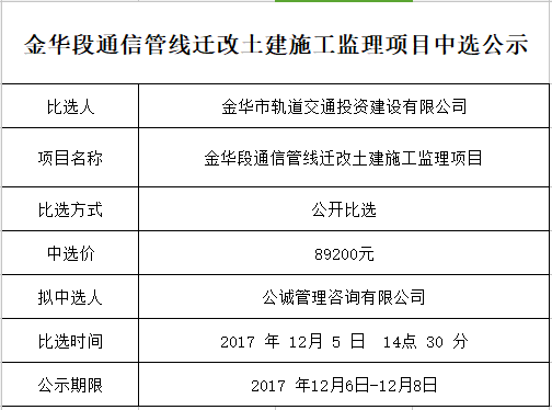 金華段通信管線遷改土建施工監(jiān)理項(xiàng)目中選公示
