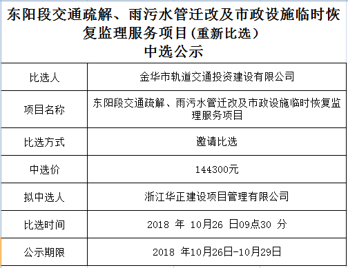 東陽(yáng)段交通疏解、雨污水管遷改及市政設(shè)施臨時(shí)恢復(fù)監(jiān)理服務(wù)項(xiàng)目(重新比選)中選公示