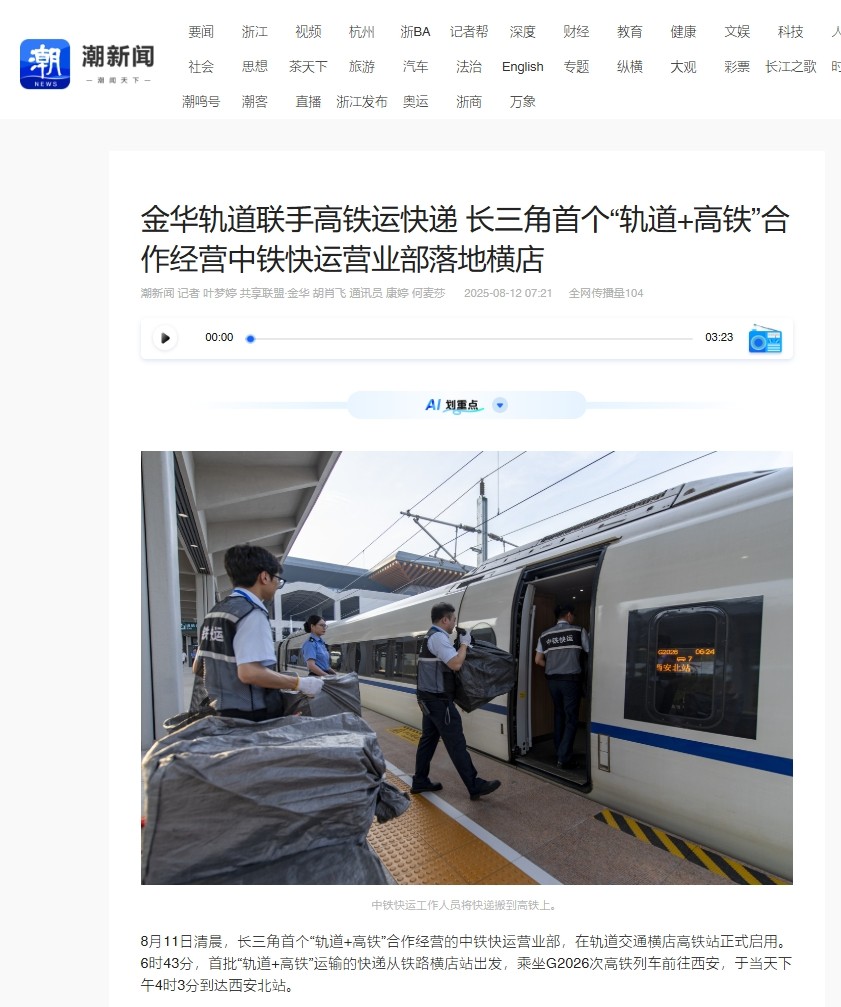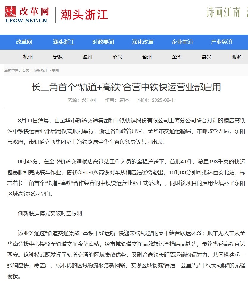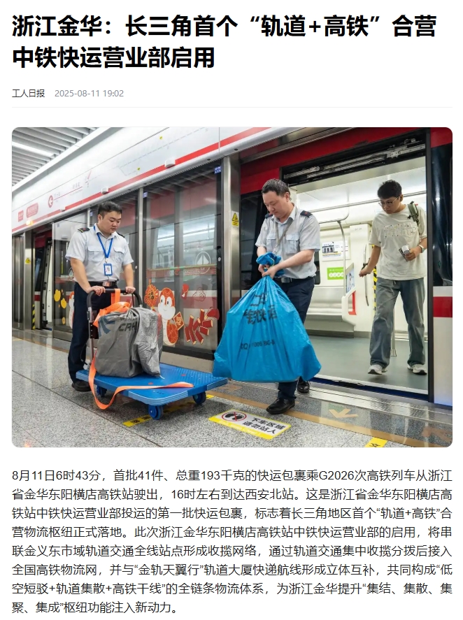 8月11日,長三角首個(gè)“軌道+高鐵”合營中鐵快運(yùn)營業(yè)部啟用。該營業(yè)部將串聯(lián)金義東市域軌道交通全線站點(diǎn)形成收攬網(wǎng)絡(luò),在全線31座車站均可辦理業(yè)務(wù),通過軌道交通集中收攬分撥后接入全國高鐵物流網(wǎng)。