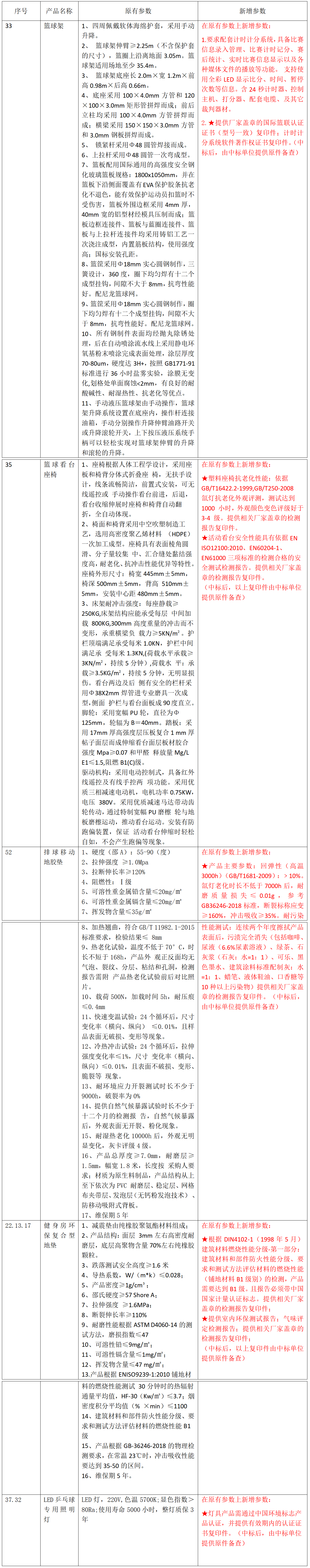 招標(biāo)文件第三章招標(biāo)項目需求附件《健身器材清單》部分技術(shù)參數(shù)修改如下,其余未修改項按原招標(biāo)文件執(zhí)行。